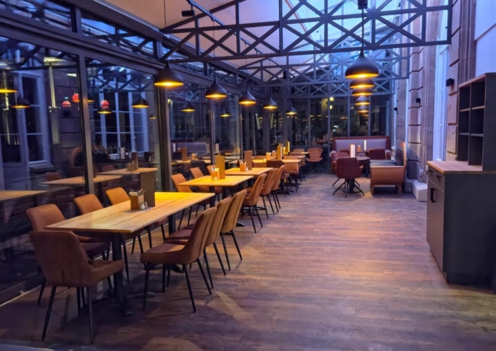 Blick auf mit weissen Tischdecken zum Frühstück gedeckte runde Bistrotische vor der Sandsteinfassade des Hotels , unter einer rot weiss gestreiften Jalousie. Die Sonne scheint, man sieht Bäume und den Harmoniegarten im Hintergrund